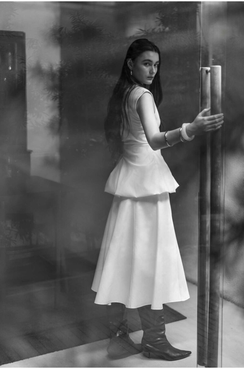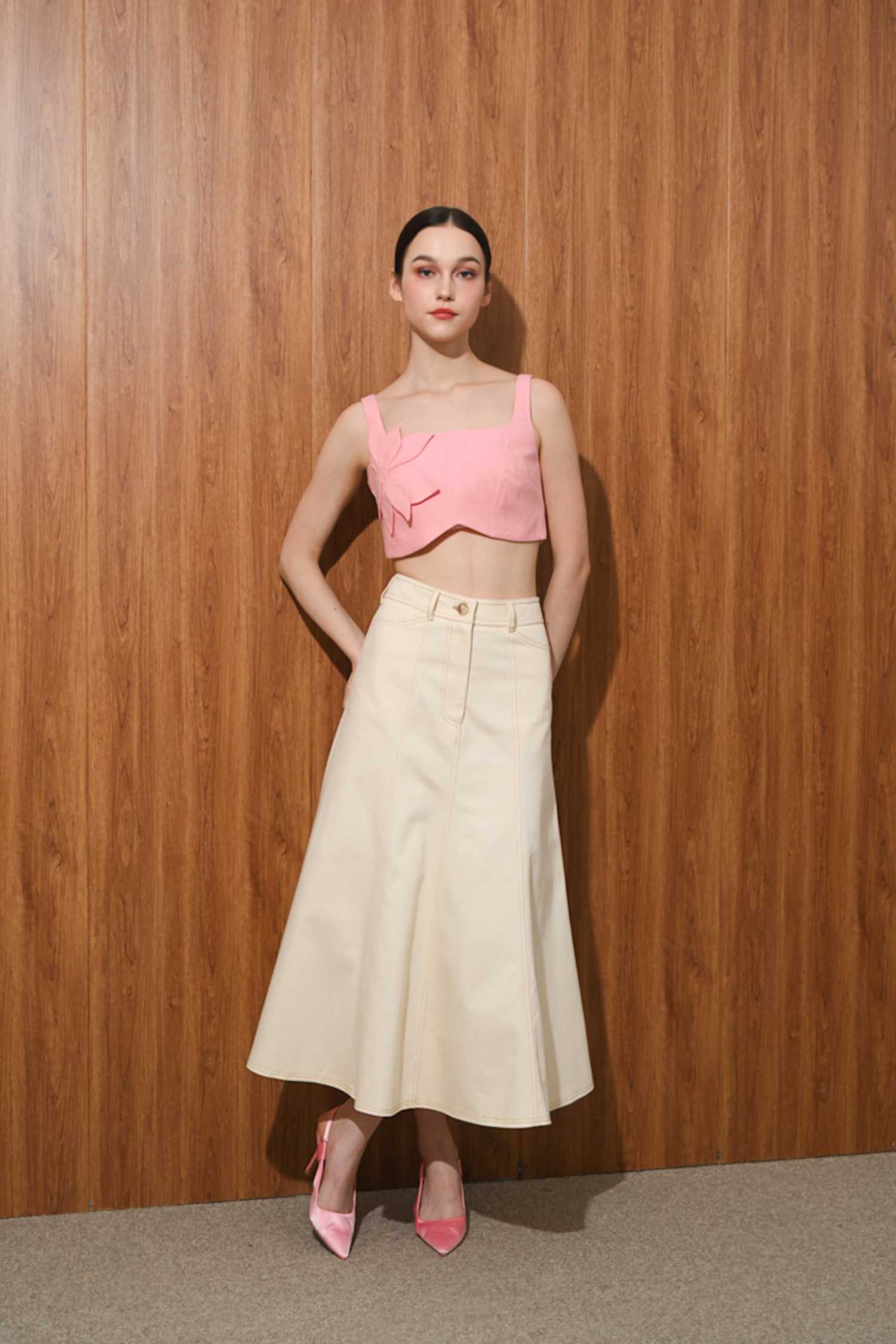 A denim skirt made to be midi-lengthIt and has a structured, A-line with flared silhouette below the hip that holds its shape.