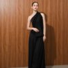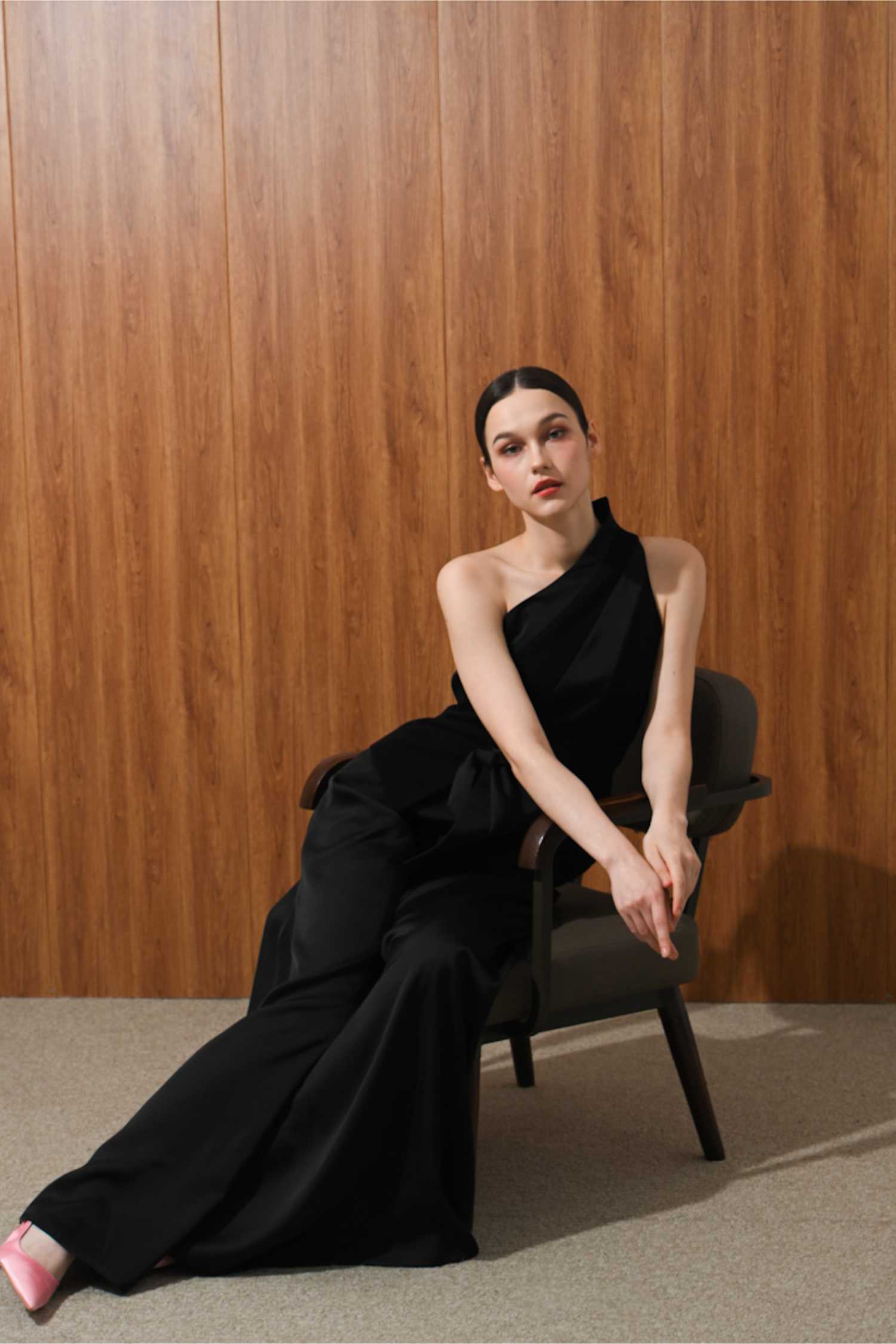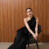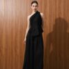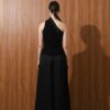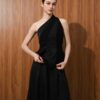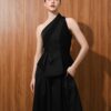 The top made is made out of two combination of matte and shine material It features an asymmetrical, one-shoulder design. There's a peplum that creates volume and structure. The fit seems tailored and sophisticated.