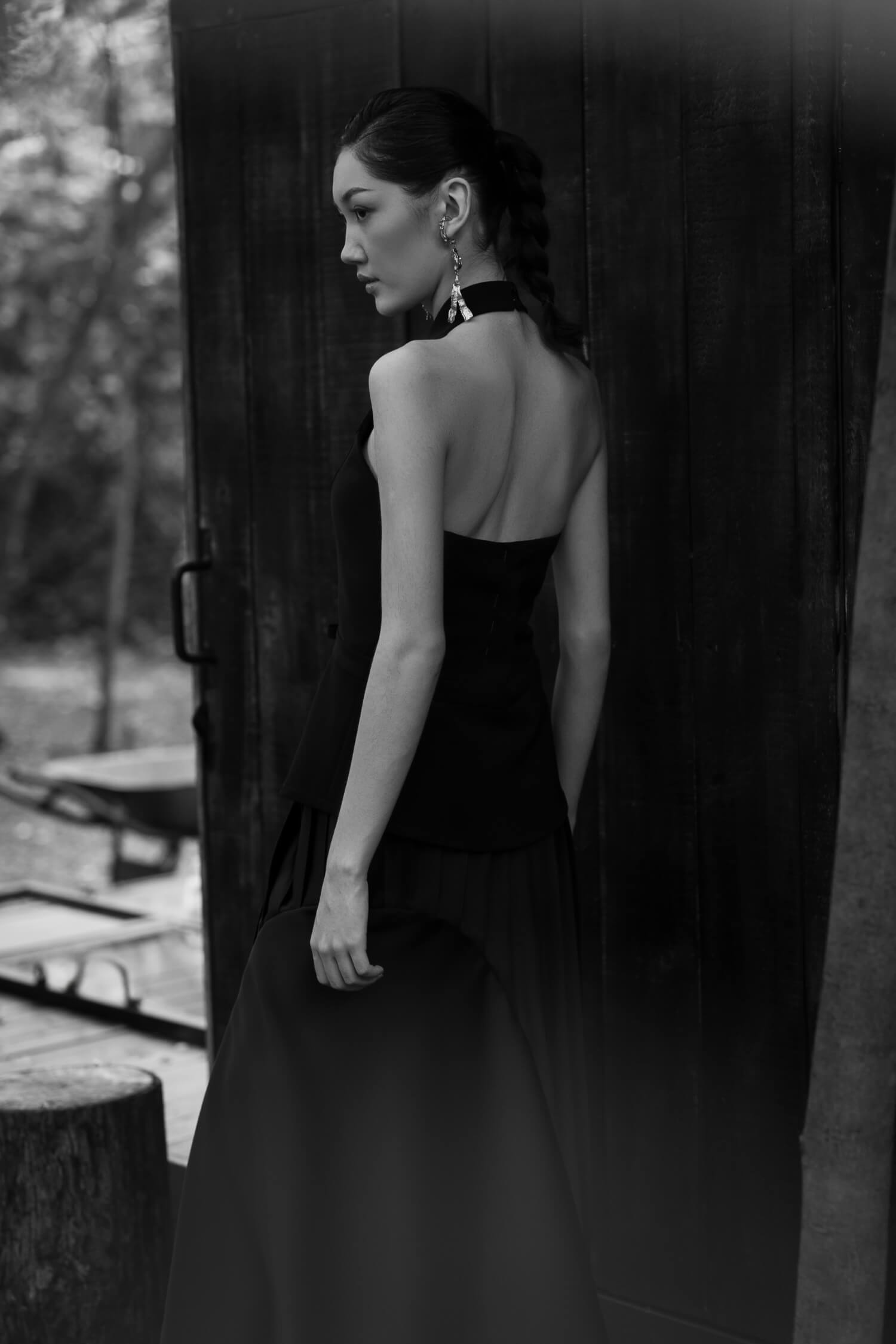 An A-symmetrical bias skirt, made from satin with a pleated details at one side.