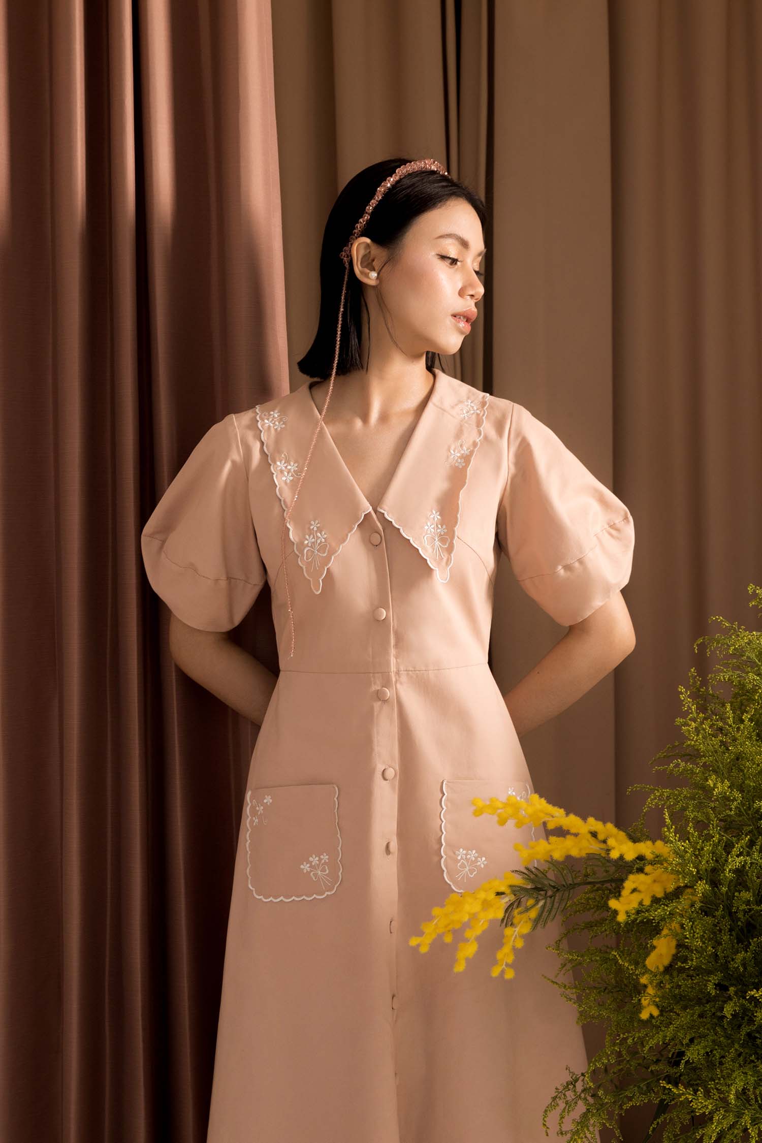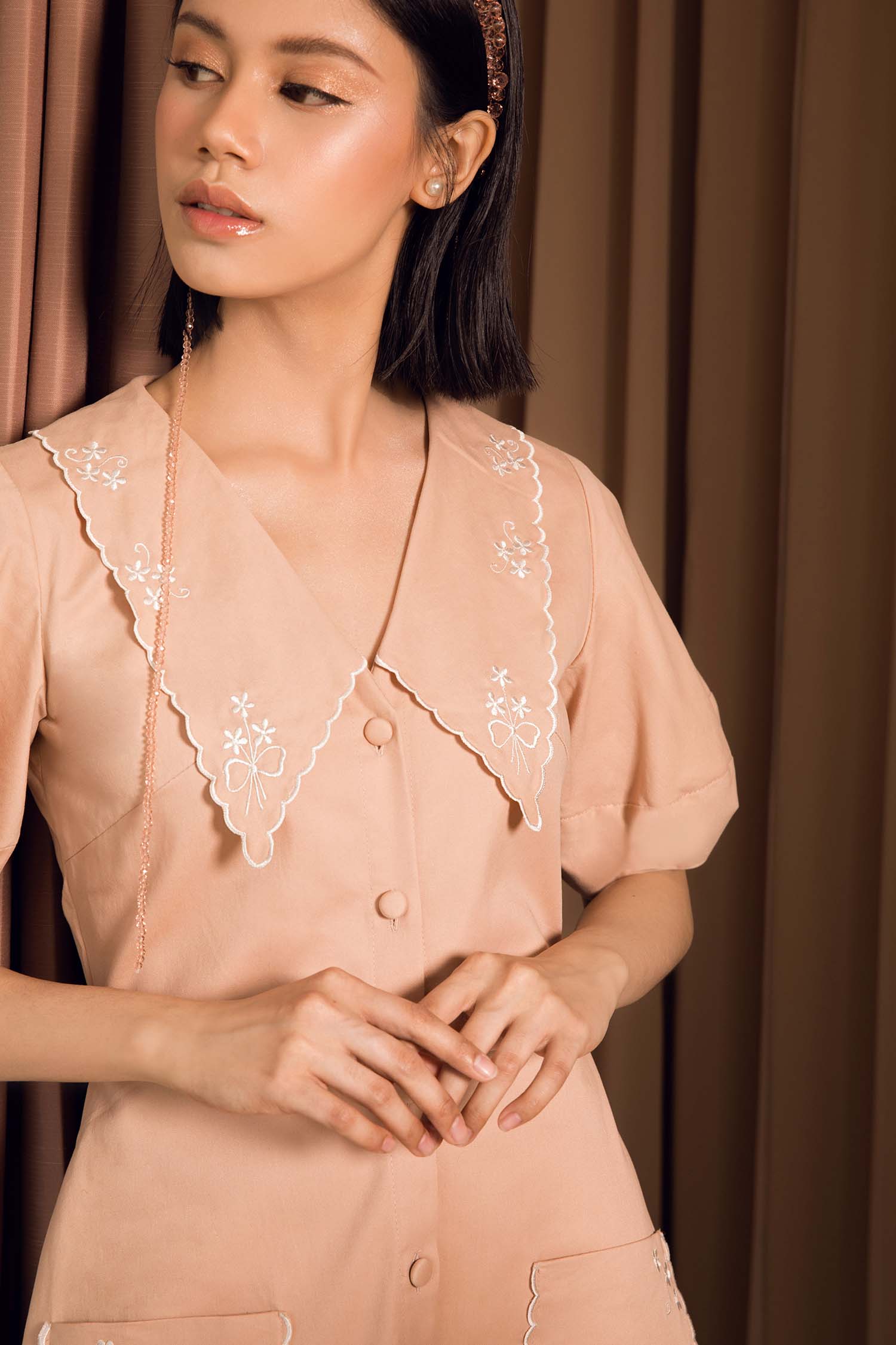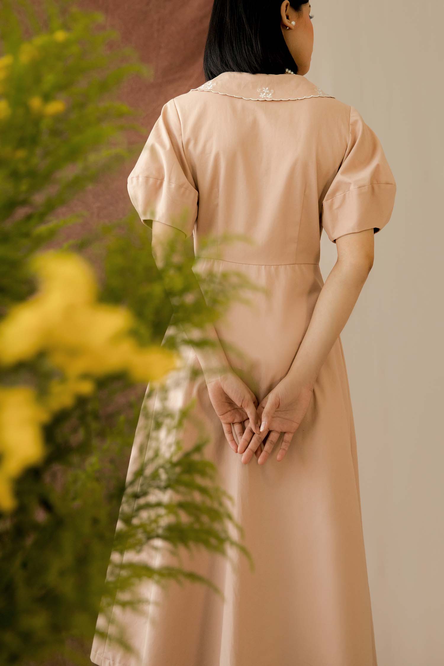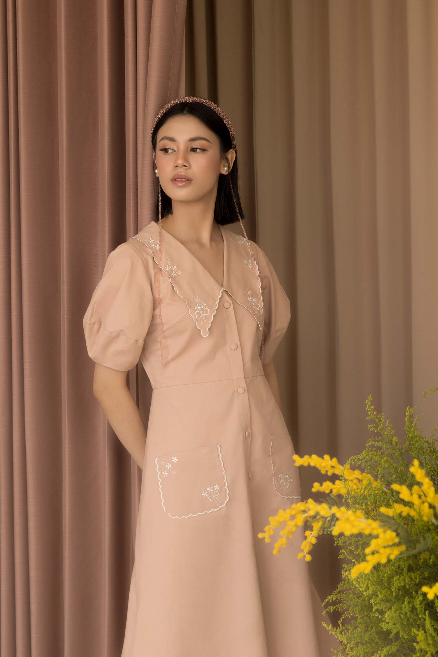 Beautifully embroidered collar with tiny flower, and a unique shape of sleeve comes perfect with pale pink colour dress.